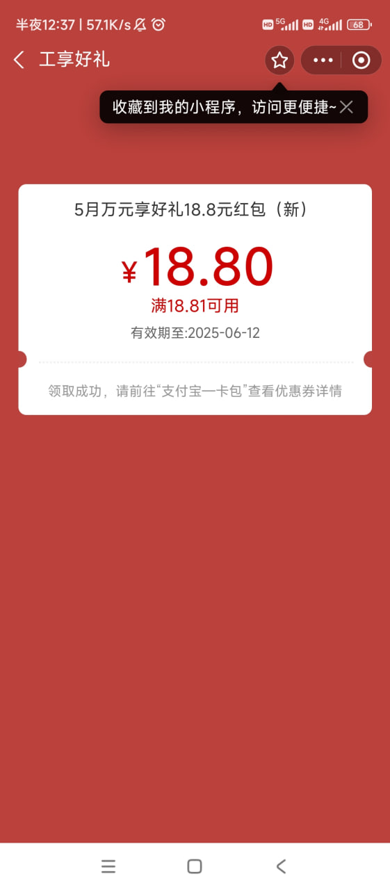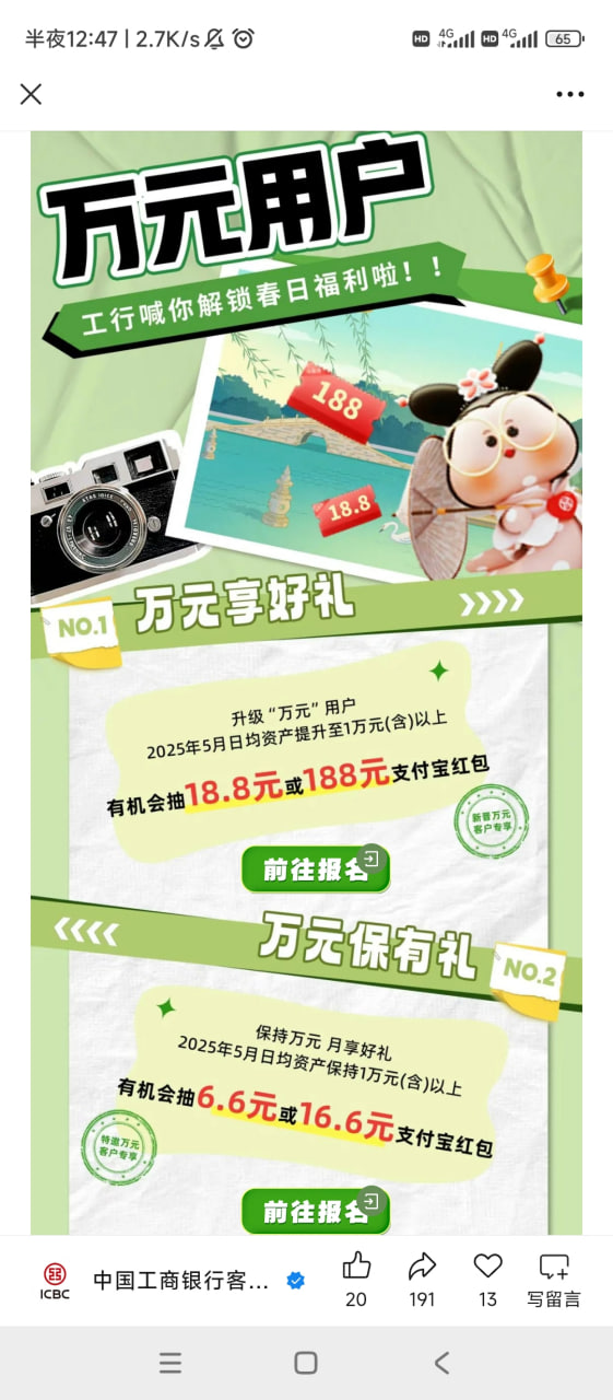 如图,关注中国工商银行,保持一个月1w,次月抽188或者18.8。我运气不好,才抽到18.8。速度冲!在座各位哪个不是人均百万千万!