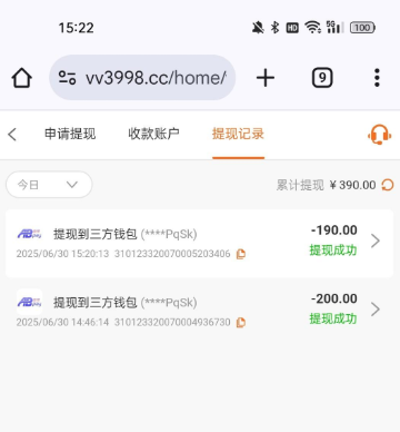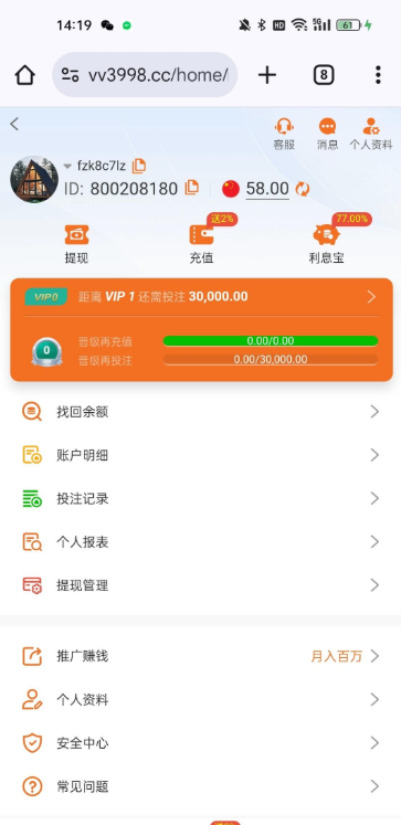 网址V7777.com,注册了两天,没绑定银行卡,今天上号看了一下,没一会电话就来了,送了58,打到200出款了秒到,又充了五十,下了190。