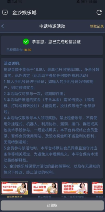我是接到的电话,短信验证通过直接到账18.8u.,我看了下平台网站,还可以去飞机申请,没事的可以去试试看852963.vip,短信验证领18.8u