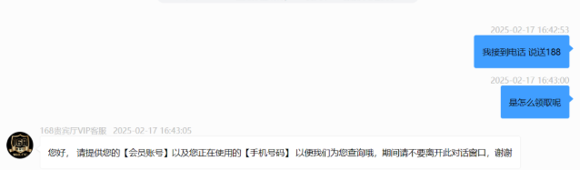 2025-02-17 21:27:14接到电话送188avatar168贵宾厅客服012025-02-17 21:27:39您好 平台没有电话彩金哦 请您了解其他活动 谢谢