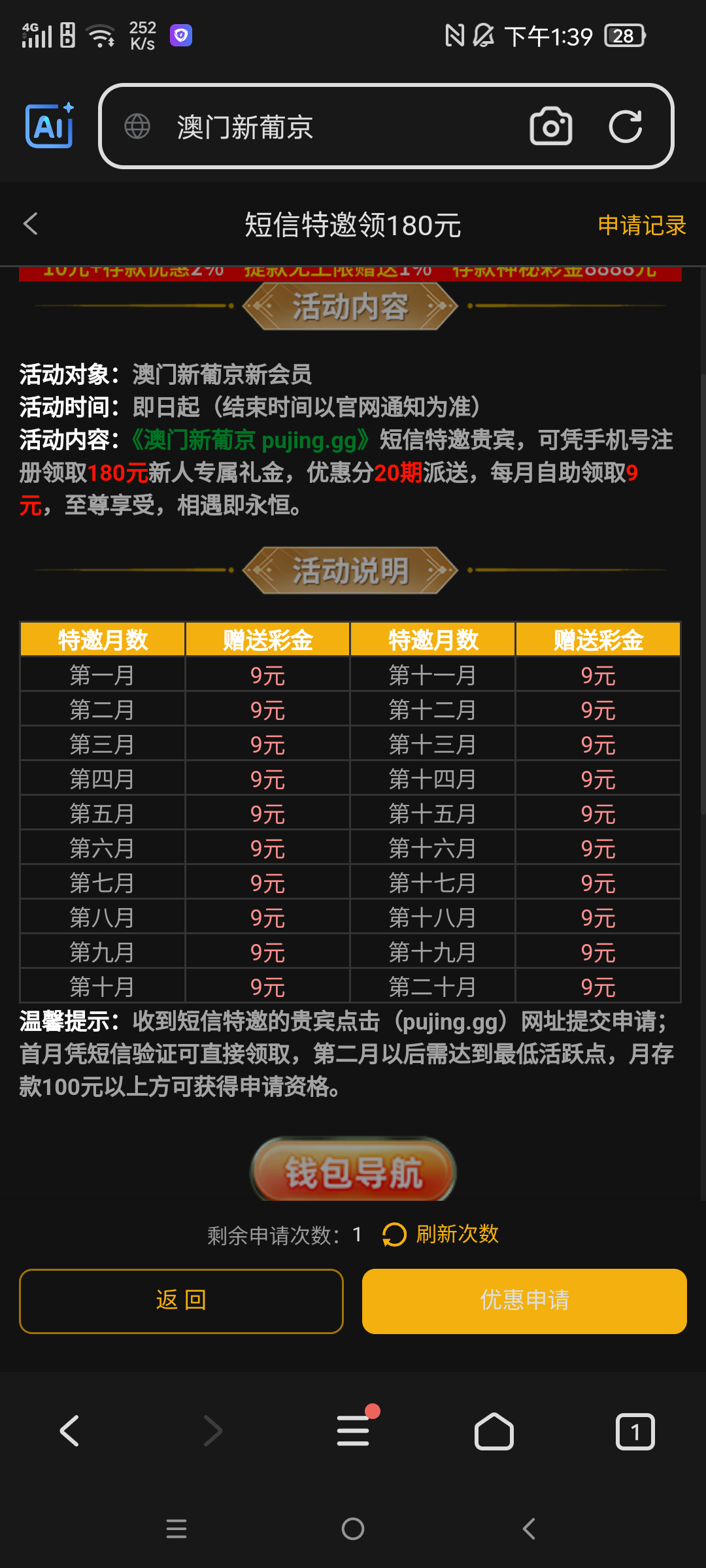 注册绑卡,绑定钱包优惠新人自助申请每月9元,共计180元,出款自测