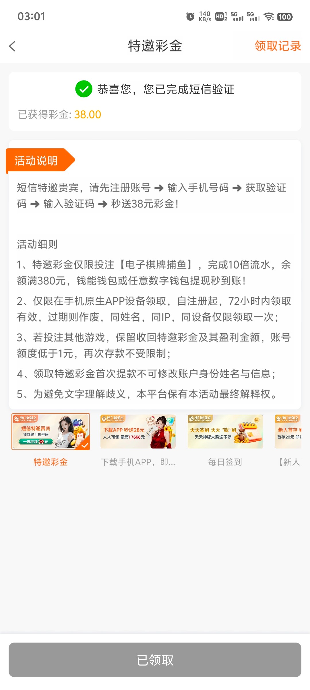 手机验证送38,不用充值,满足要求盈利380以上可以提款需要下载app。有个app彩金需要存10元,送28。还有首存20送20,五倍流水。