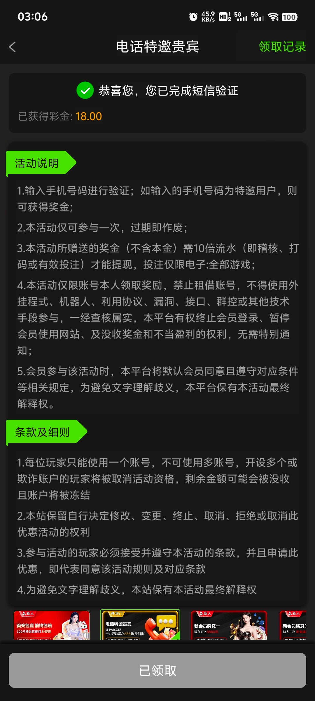 短信验证送18,这个注意如果有多个手机号要用不同的ip,同ip只送一个。