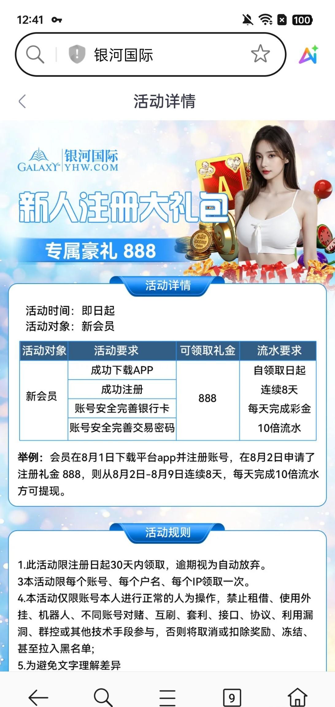 注册绑定银行卡以后日常活动领取,绑定了就能领取,必送的!888彩金需要完成8880流水才能提现,当天完成了8880流水第二天还能送888,大家当欢乐豆打就行了要是真的有人出款了麻烦给我团个饭,禁止充值