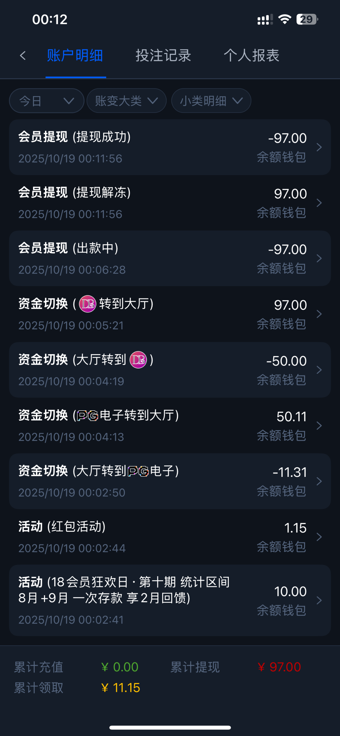 刚登录回馈送了 10 彩金,乱玩一会吃 97,