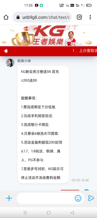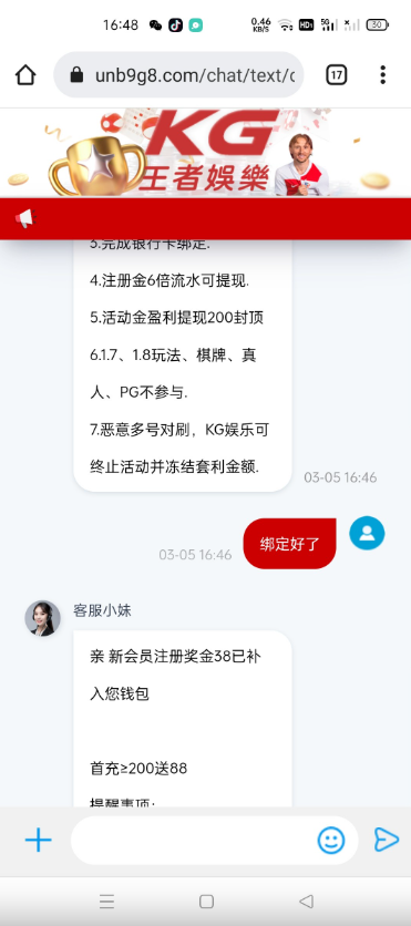 去找客服说注册送38彩金,然后绑定信息跟客服说,就送了,出款上限200我没打出来,自测。