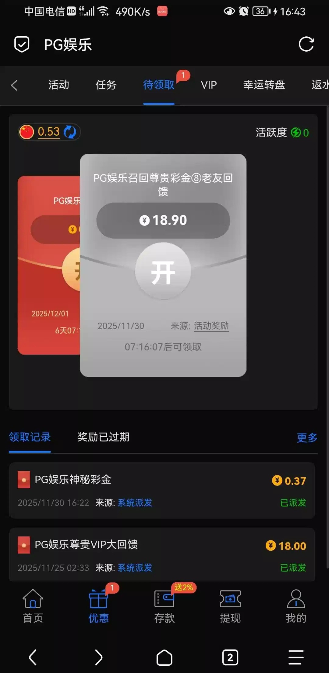 不知道是否需要充值过,我两个台几个月没有充值了,2号可领。