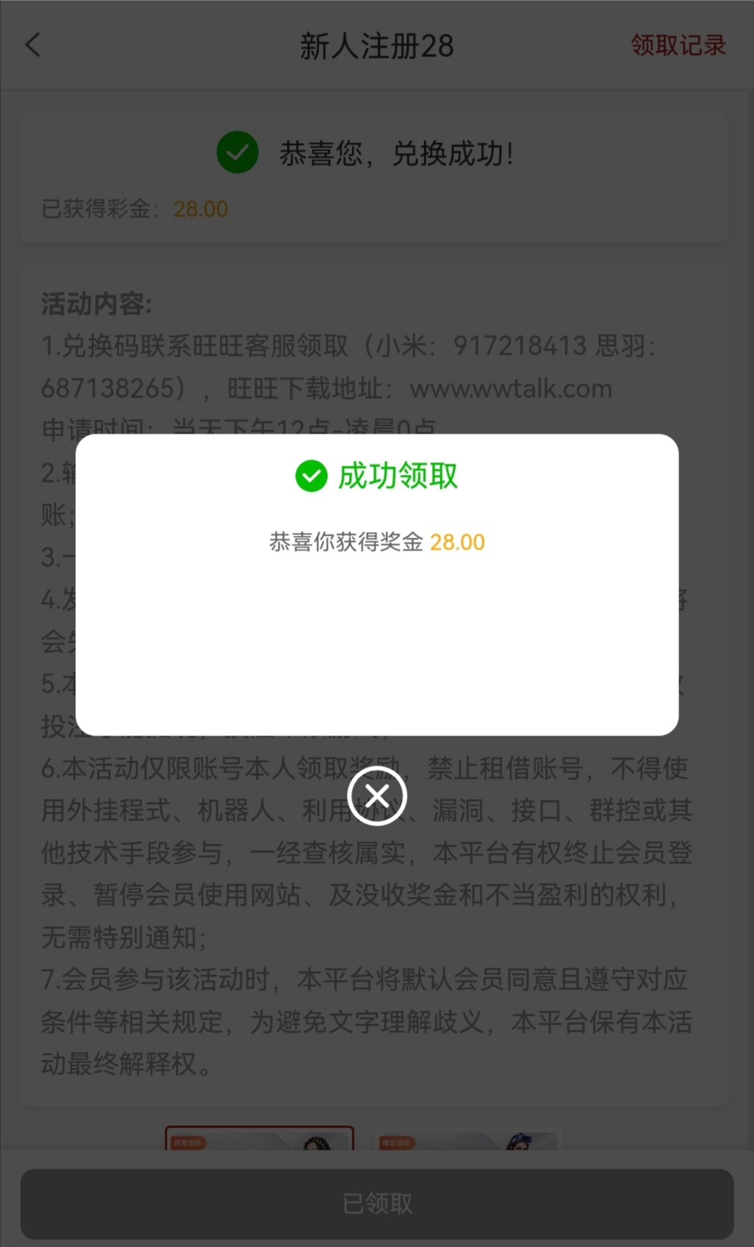禁止充值,禁止充值注册后点优惠里面那个福利专员然后添加旺旺客服领兑换码要截图的话就下边红色图发旺旺客服