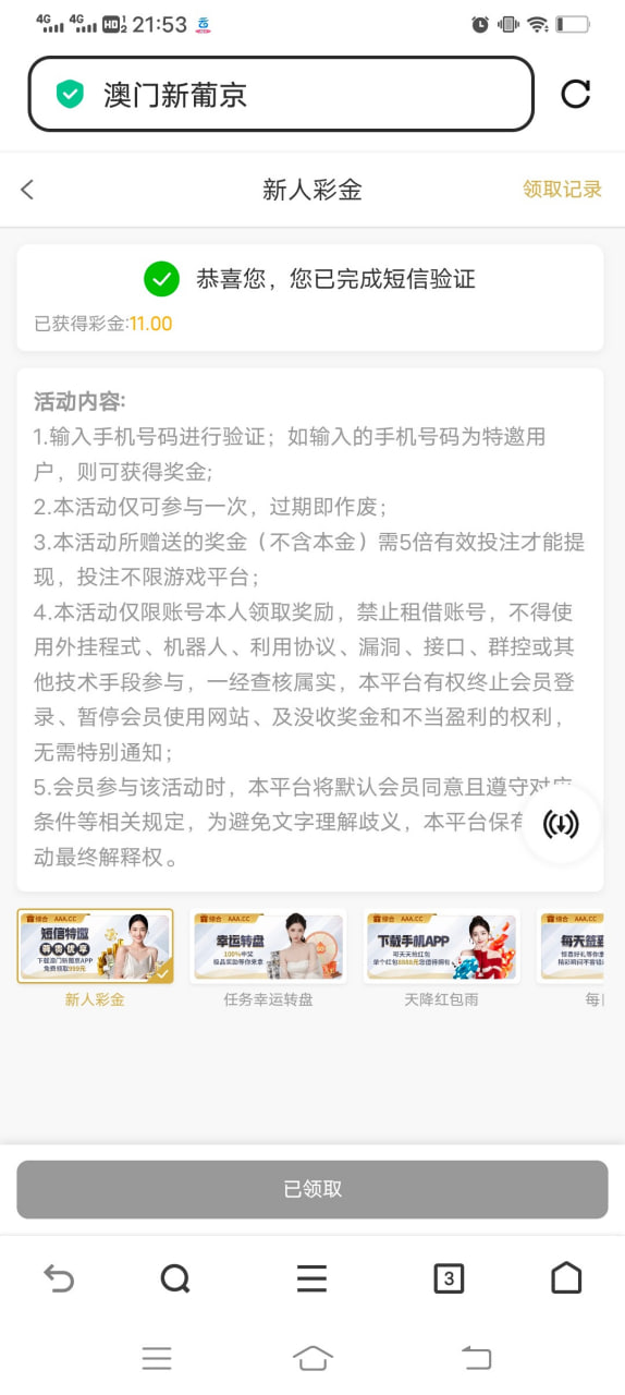 澳门新葡京收到这个短信可以去碰瓷下,55791.org 新人特邀第一个,我一把挂,勿充值!