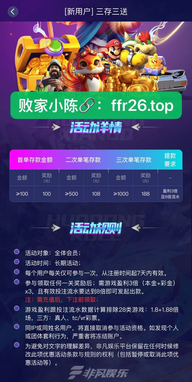 首存100+100,二存500+108,三存1000+108, 活动只限新用户参与规则细看上图!